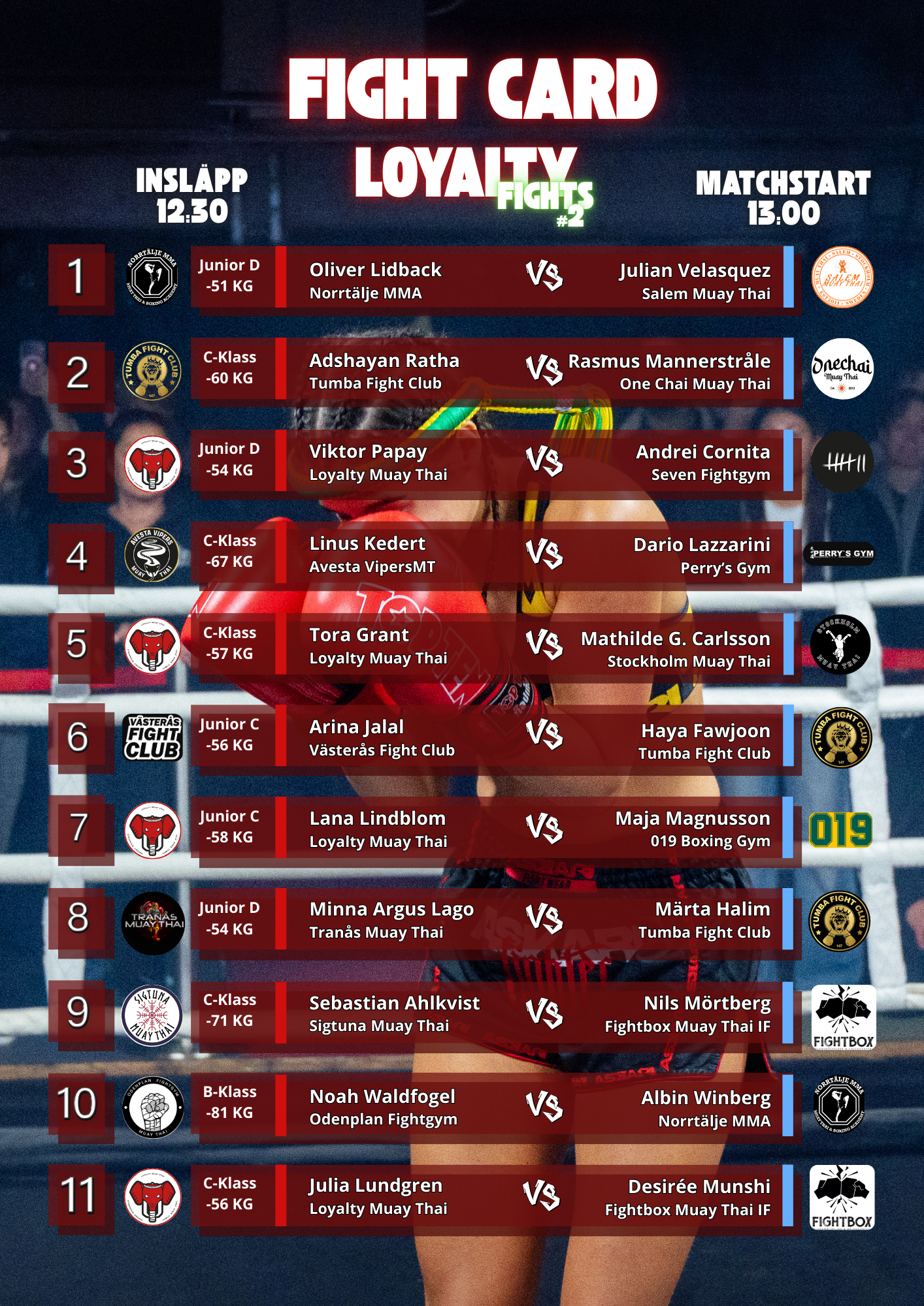 Efter en grym första gala fortsätter vi bygga Loyalty Fights på vårt sätt. En gala där saker funkar. Där fighters har gott om plats, utan stress och strul och blir ordentligt omhändertagna hela vägen. Så fokus kan ligga på det som faktiskt betyder något – matcherna.